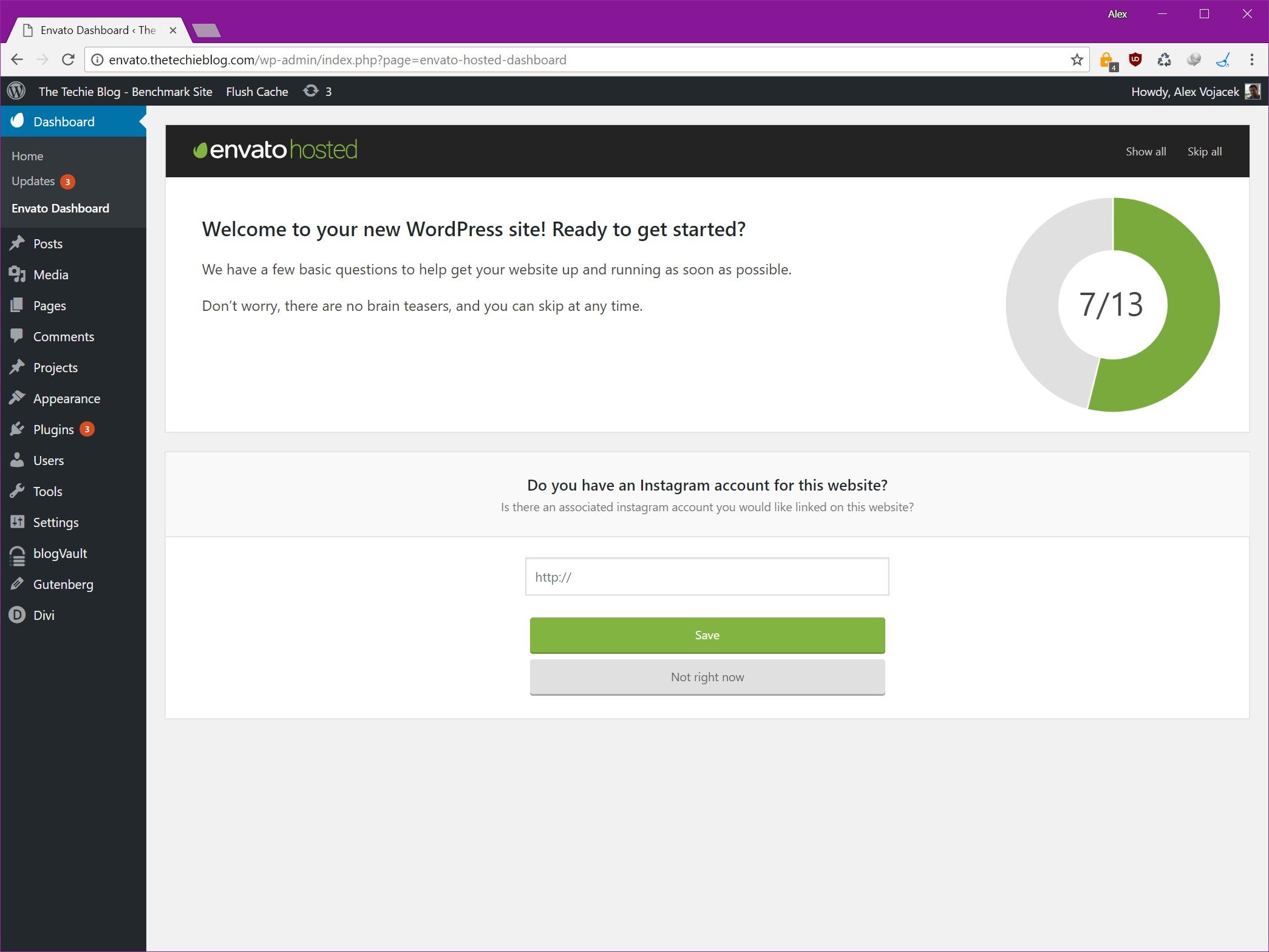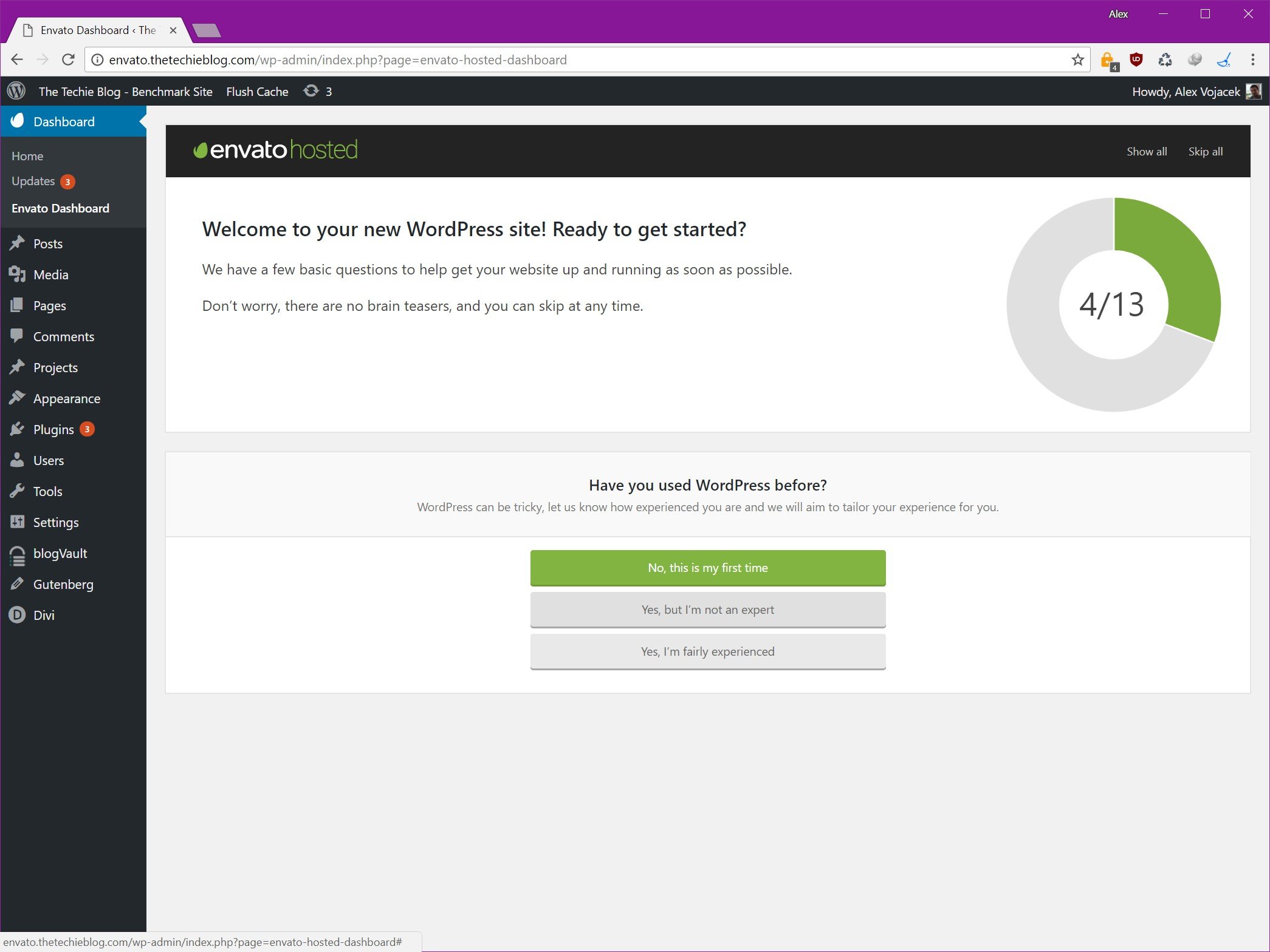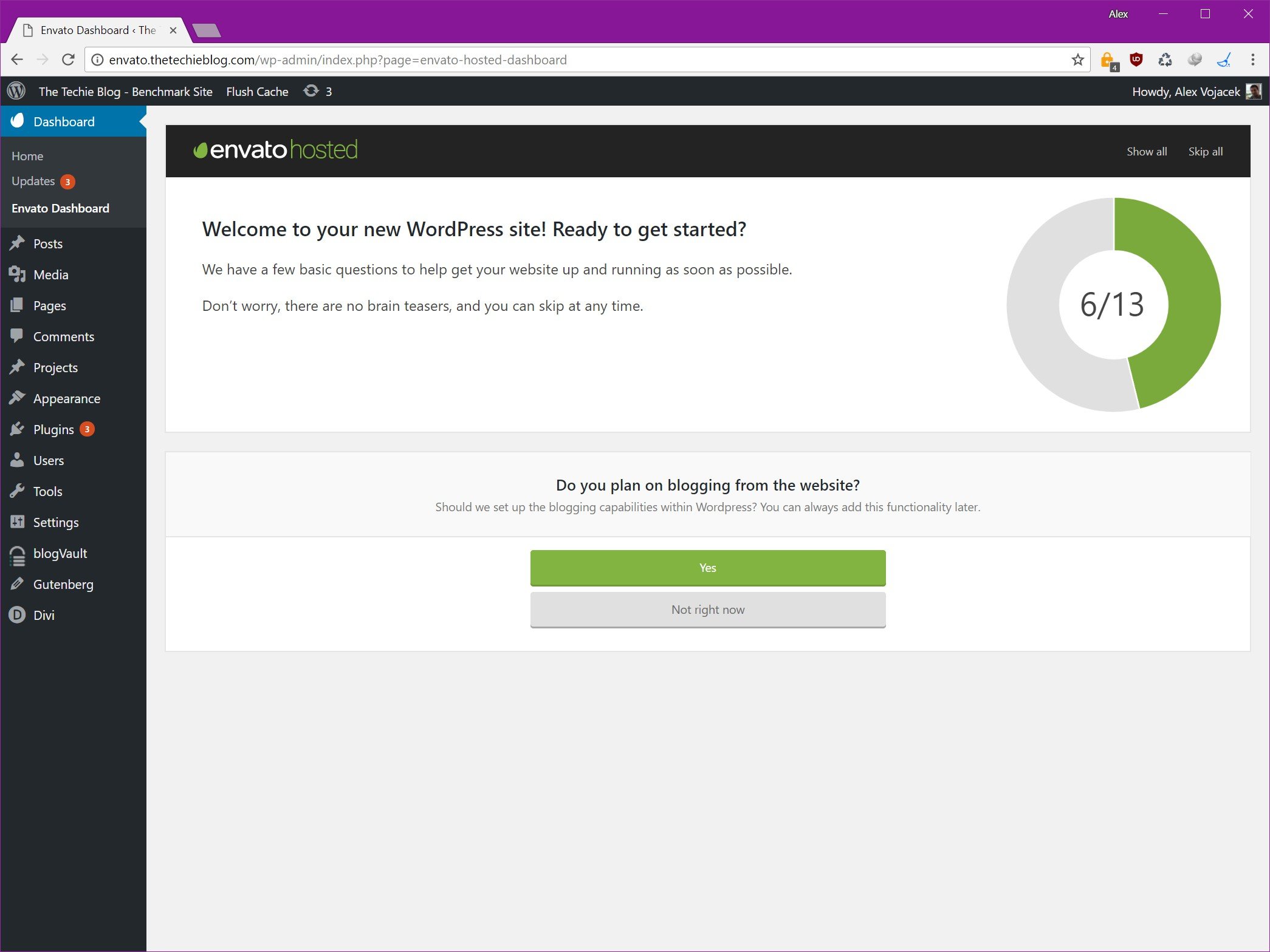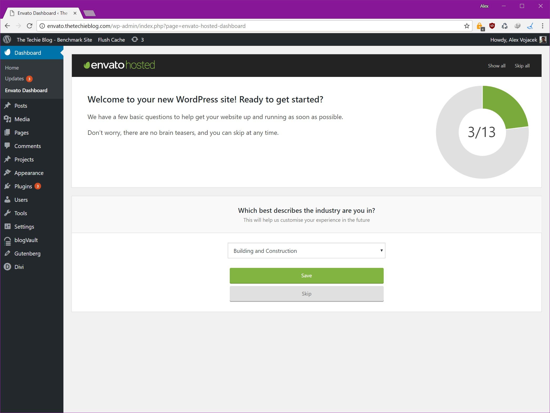 Once your site is finished migrating you’ll be greeted with a Welcome Message and a short survey. A little intrusive for my taste but easily avoidable in which Envato will ask what kind of site, type and business kind you have. Once this is done your site is ready to rumble.