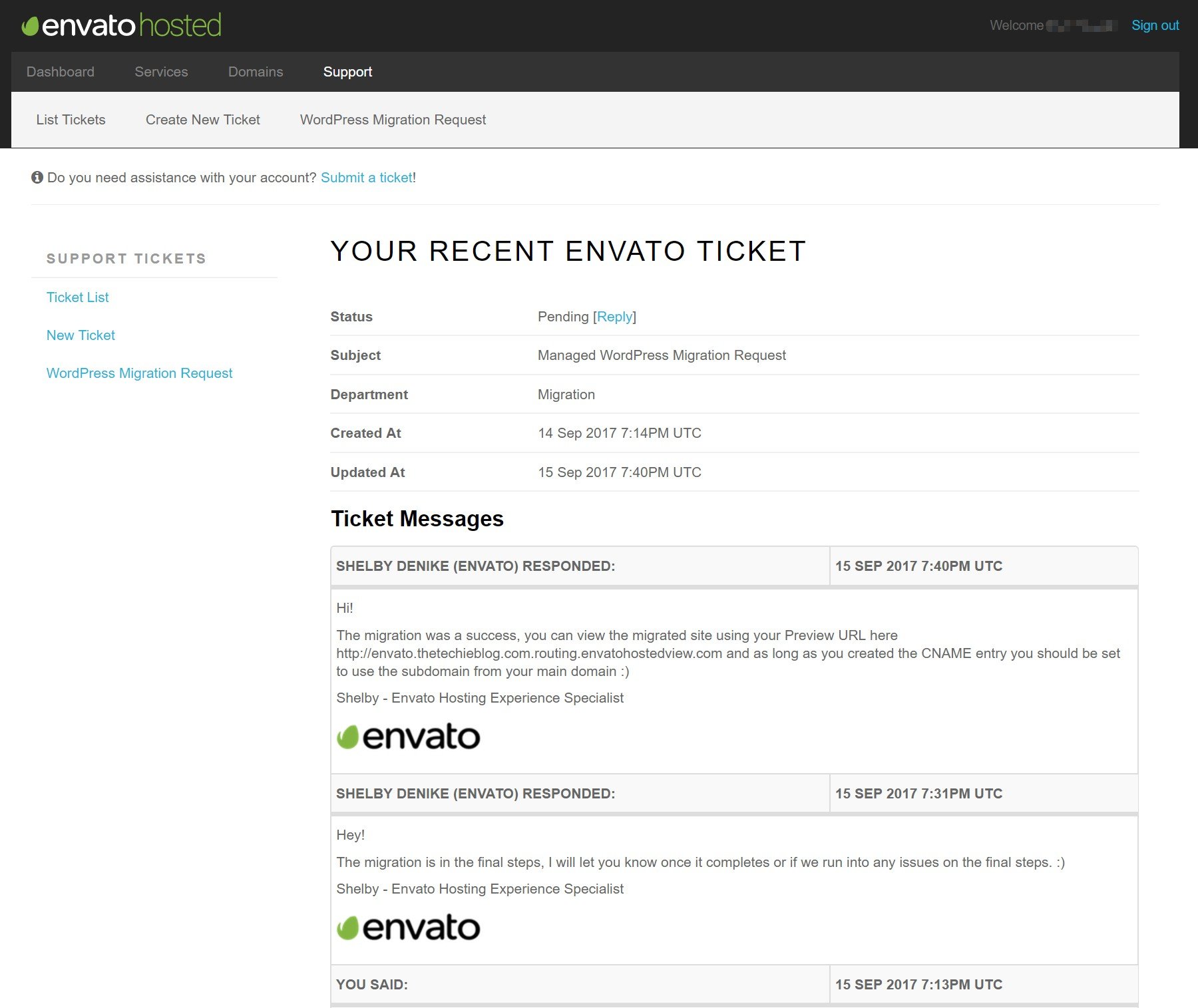 Once you input all the information you’ll be taken to the support page and you’ll have to wait sometime between 1 hour and up to 10 depending on the site complexity. Just take into consideration that the service is not automatic and will need human interaction on their part so this may not be the best alternative for those that know how to do a migration and want to do it themselves because that’s just not possible here.