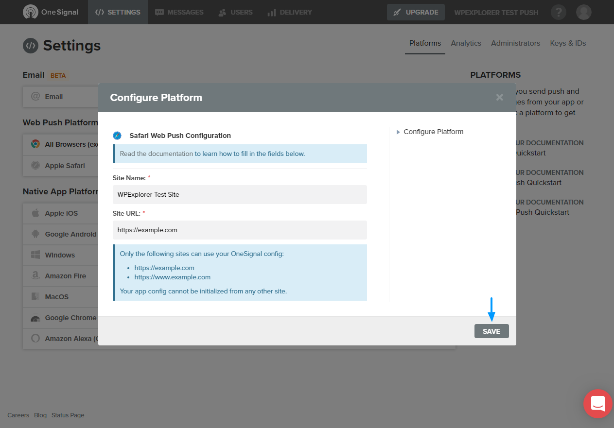 Scroll towards the bottom of the above page and hit the Save button. Now, your OneSignal push notifications are active and supported on all major browsers. The best part is the free OneSignal account supports up to 30,000 web subscribers. The free account supports an unlimited number of mobile subscribers.